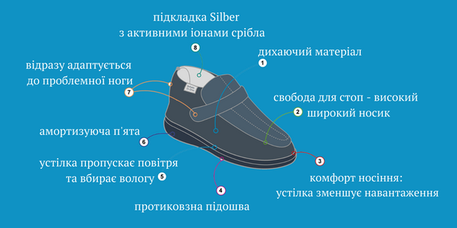 Частина моделей діабетичного взуття Доктор Орто створена за технологією Silber. Додавання іонів срібла надає взуттю багато позитивних характеристик. Такий матеріал добре нейтралізує неприємний запах, підходить для алергіків, має антибактеріальну дію. Матеріал підкладки Silber добре вбирає вологу і підтримує тепловий комфорт.